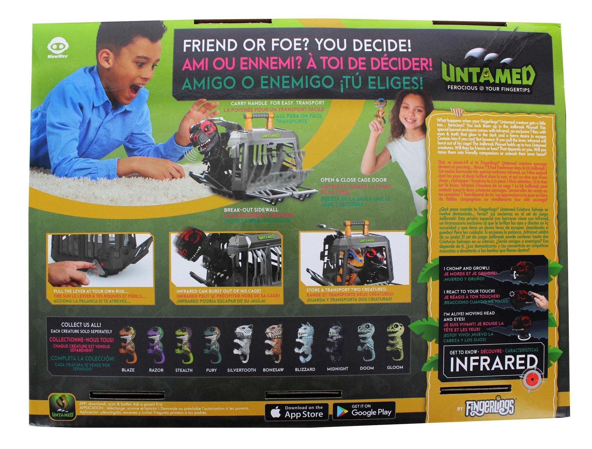 What happens when Fingerlings Untamed Dinosaurs get a little too… ferocious? You give them a time-out in the jailbreak playset! This special cage comes with "Infrared", an exclusive T-Rex with eyes that glow in the dark and a fierce desire to escape. Contain him if you can! But beware: if you pull the lever, infrared will bust out of his cage! The jailbreak playset holds up to two Fingerlings Untamed Dinosaurs. Will they be friends or foes? That depends on you. Will you tame them into friendly companions or unleash their inner beasts? 4 LR44 batteries required (included).